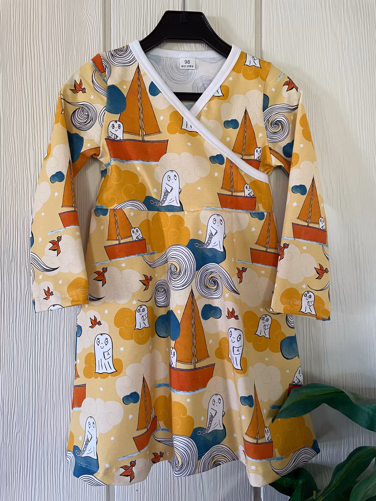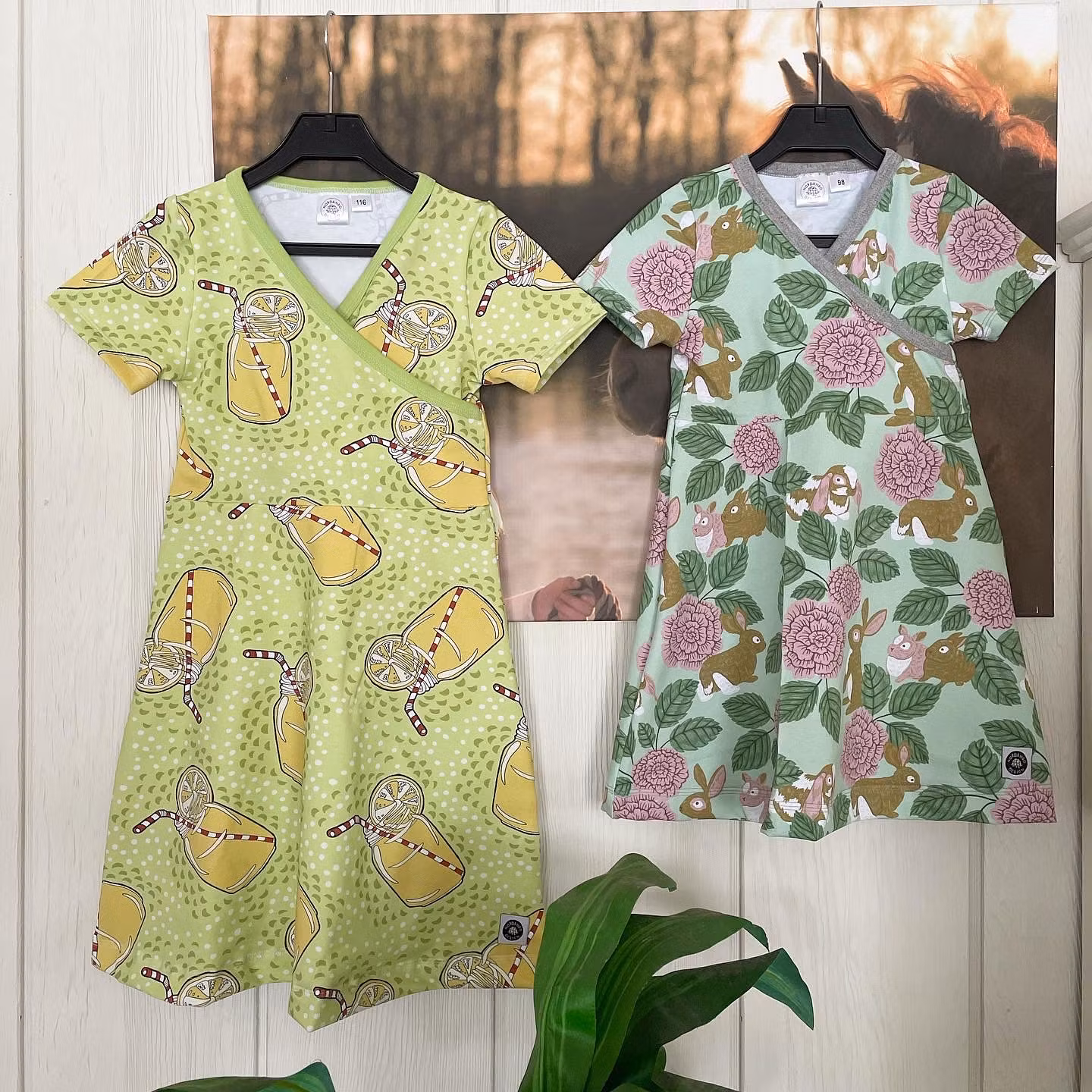 Klänning med omlott-liv och lätt utställd knälång kjol (a-linje formad). Välj mellan kort eller lång ärm.