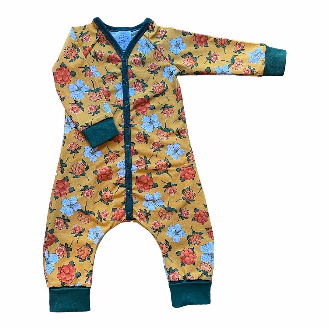 Heldress av baggy-modell med långa armar och ben. Extra långa muddar i benslut för längre användning, bara att vika ned eftersom barnet växer. Mudd även i ärmslut. Mjuk och skön mot kroppen.