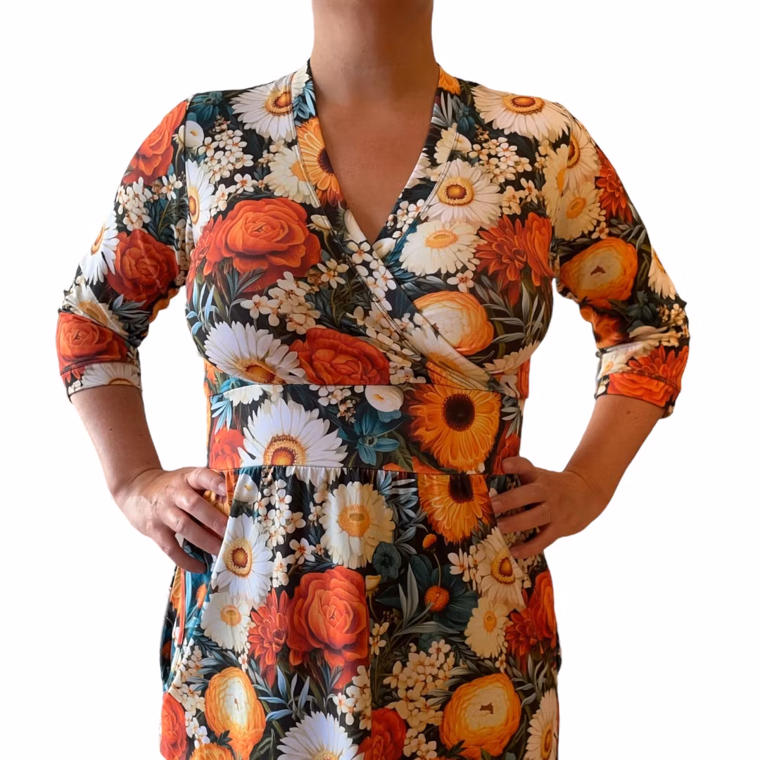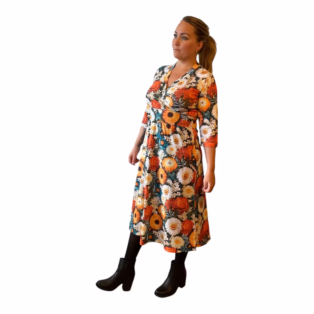Siri är en klänning med V-ringad fusk omlott. Högt skuren i midjan, lätt rynkad kjol, 3/4 ärm som går till armbågen och fickor i sidorna! Längden är till knät eller strax nedom knä. Längden på klänningen beror alltså på hur lång du är och vilken storlek du har. En fin klänning som passar utmärkt både till vardag och fest!