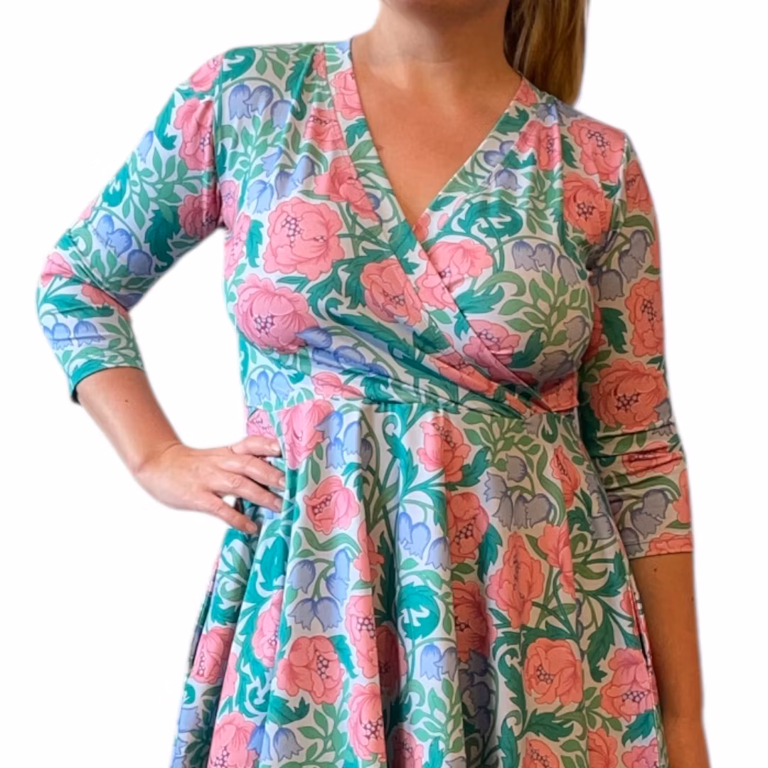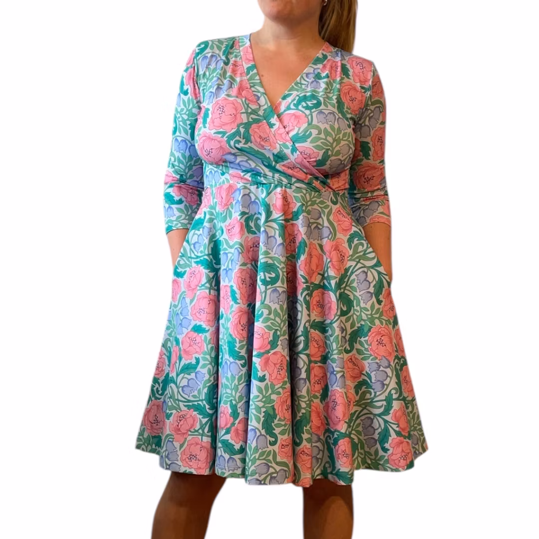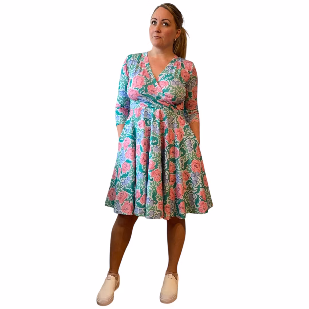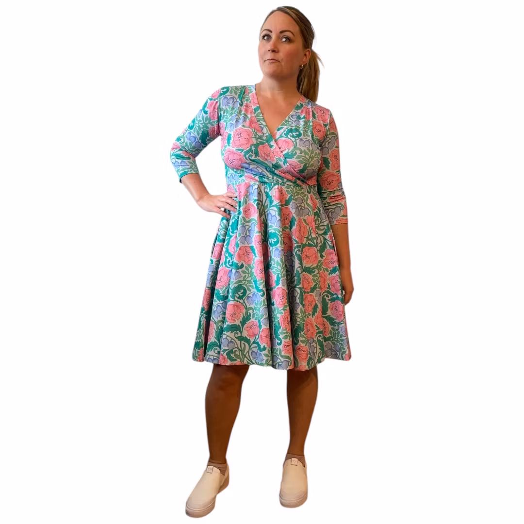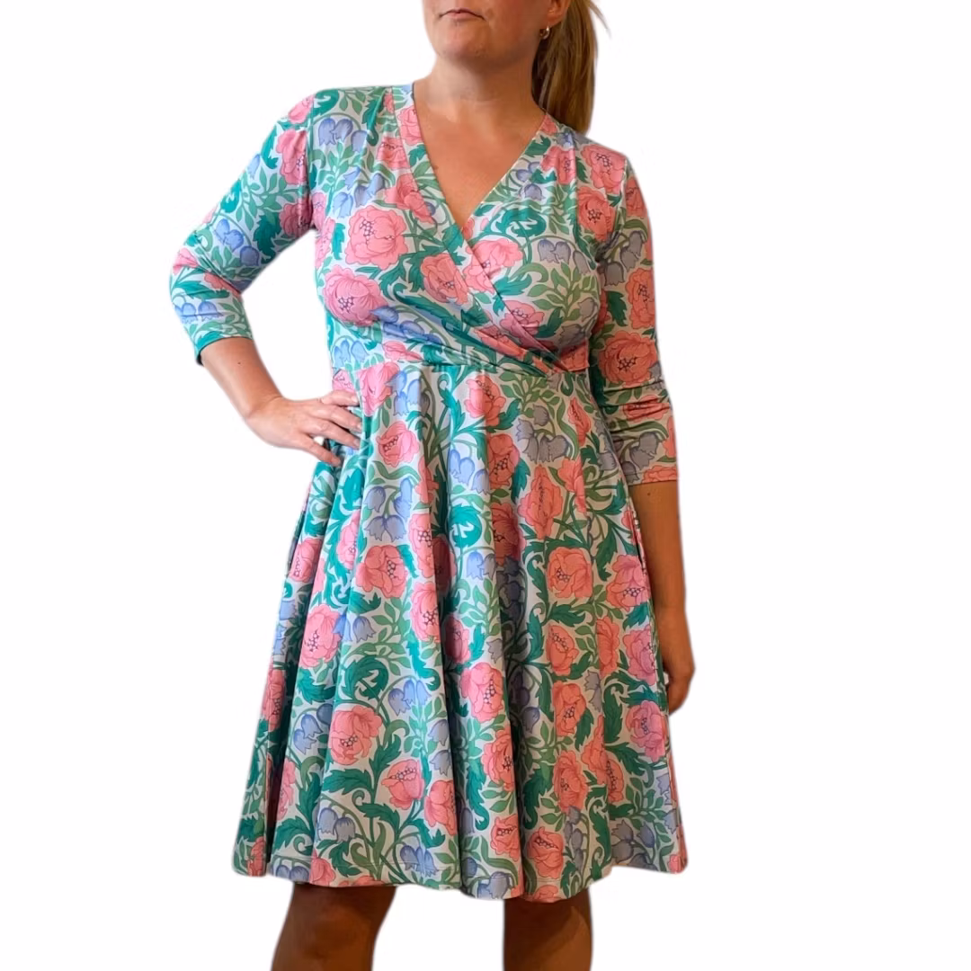 Bystomkretsen är ganska"fri" då överdelen har en omlott (v-ring) Det är meningen att klänningen ska sitta ganska tight i överdel och vara lös över höfterna. Välj storlek främst efter midjemått. Stussen får gott om plats i denna klänning!