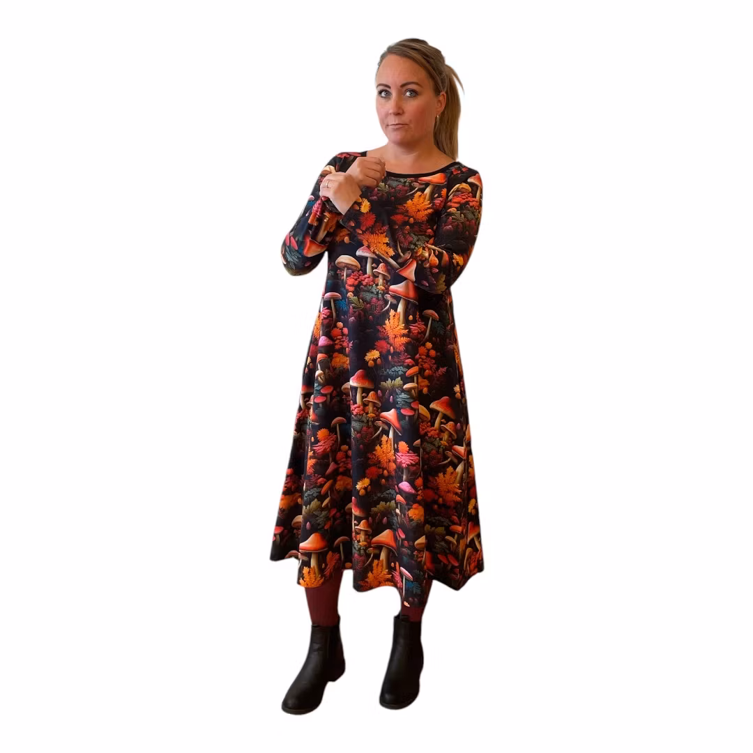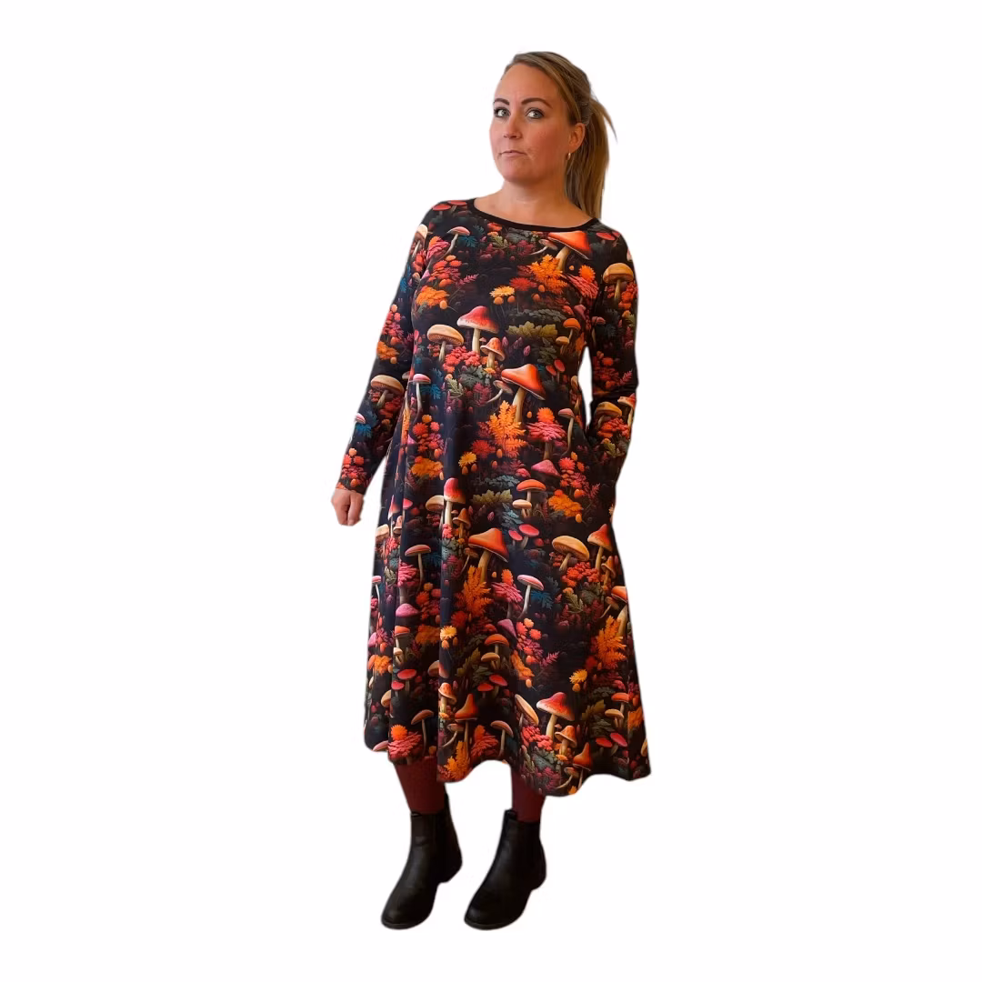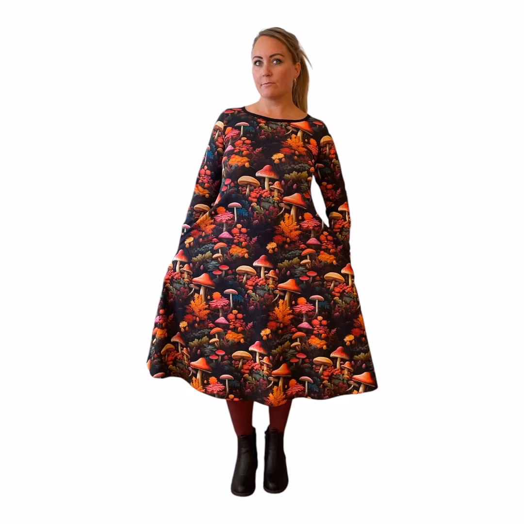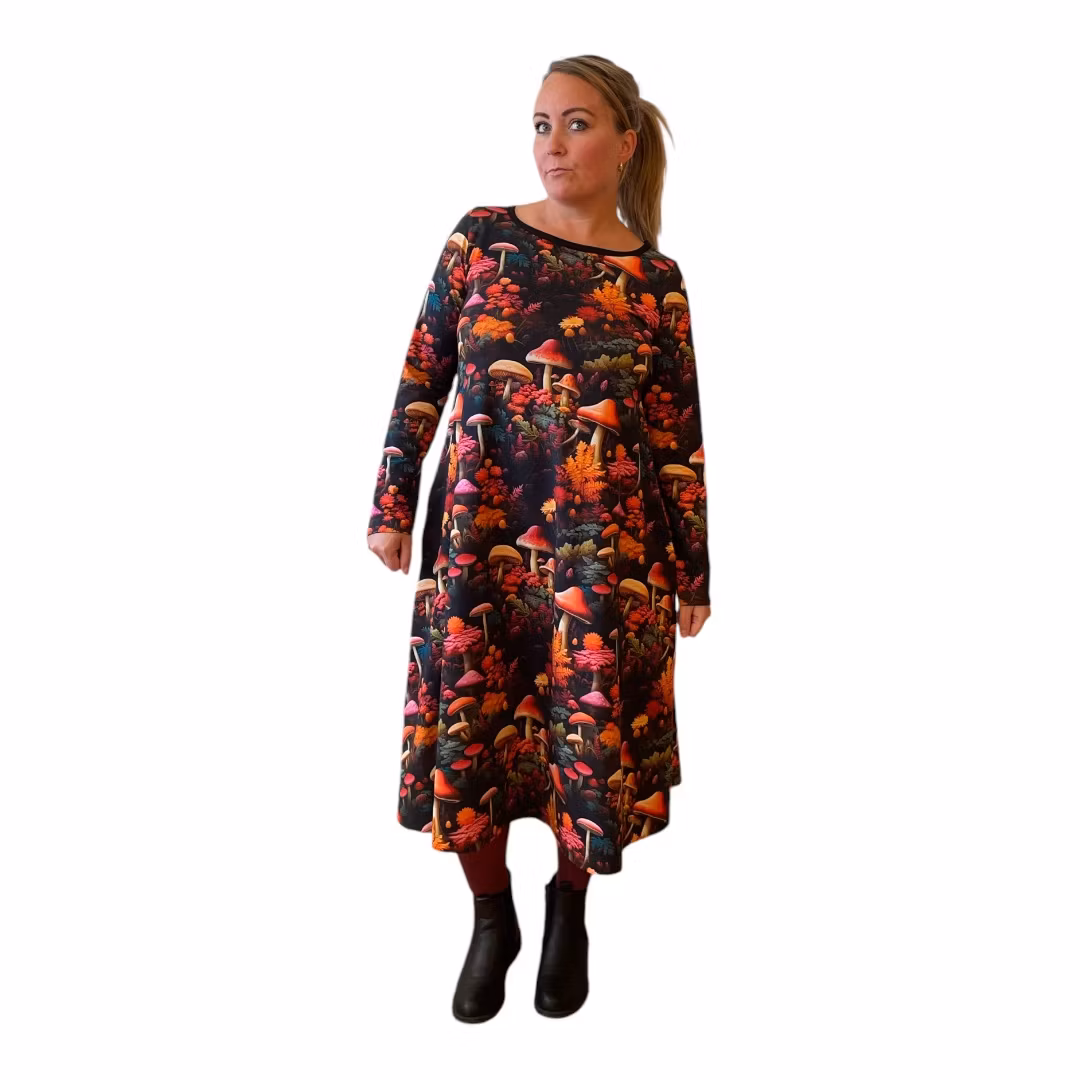 Molly Klänning med lång ärm i tyget Fungi, svart kantband i hals och dolda fickor i sidosömmen!