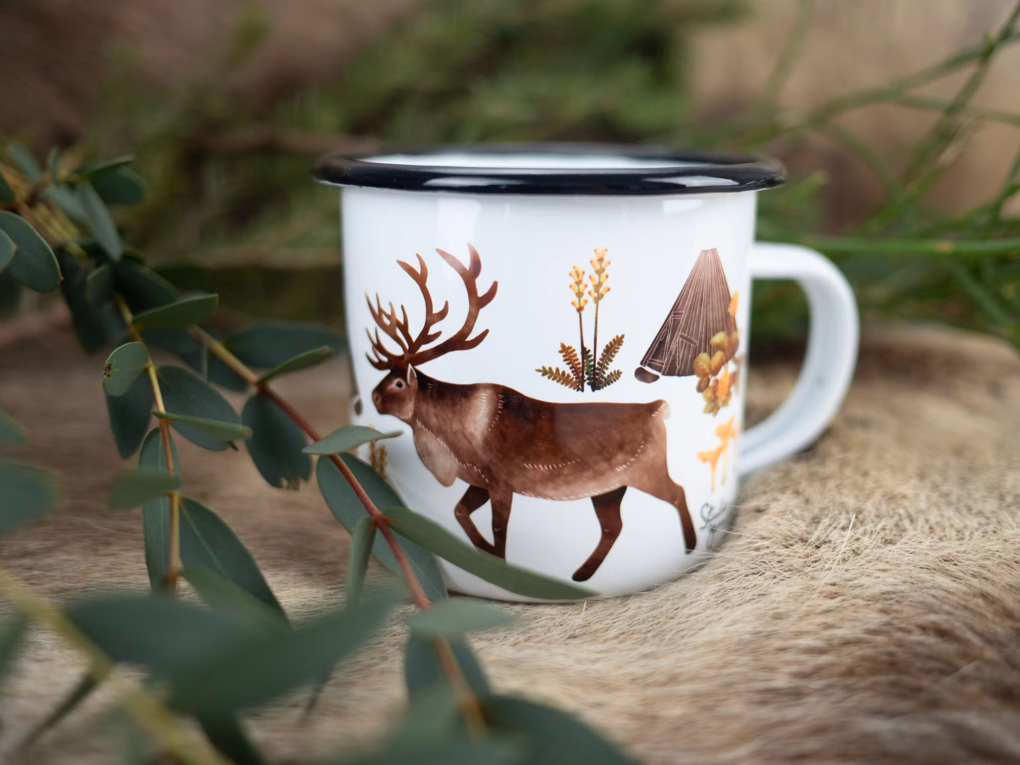 Emaljmugg "RENAR" med motiv av renar, kåtor, kantareller, kung karls spira & hjortron. Motivet sträcker sig runt hela muggen.