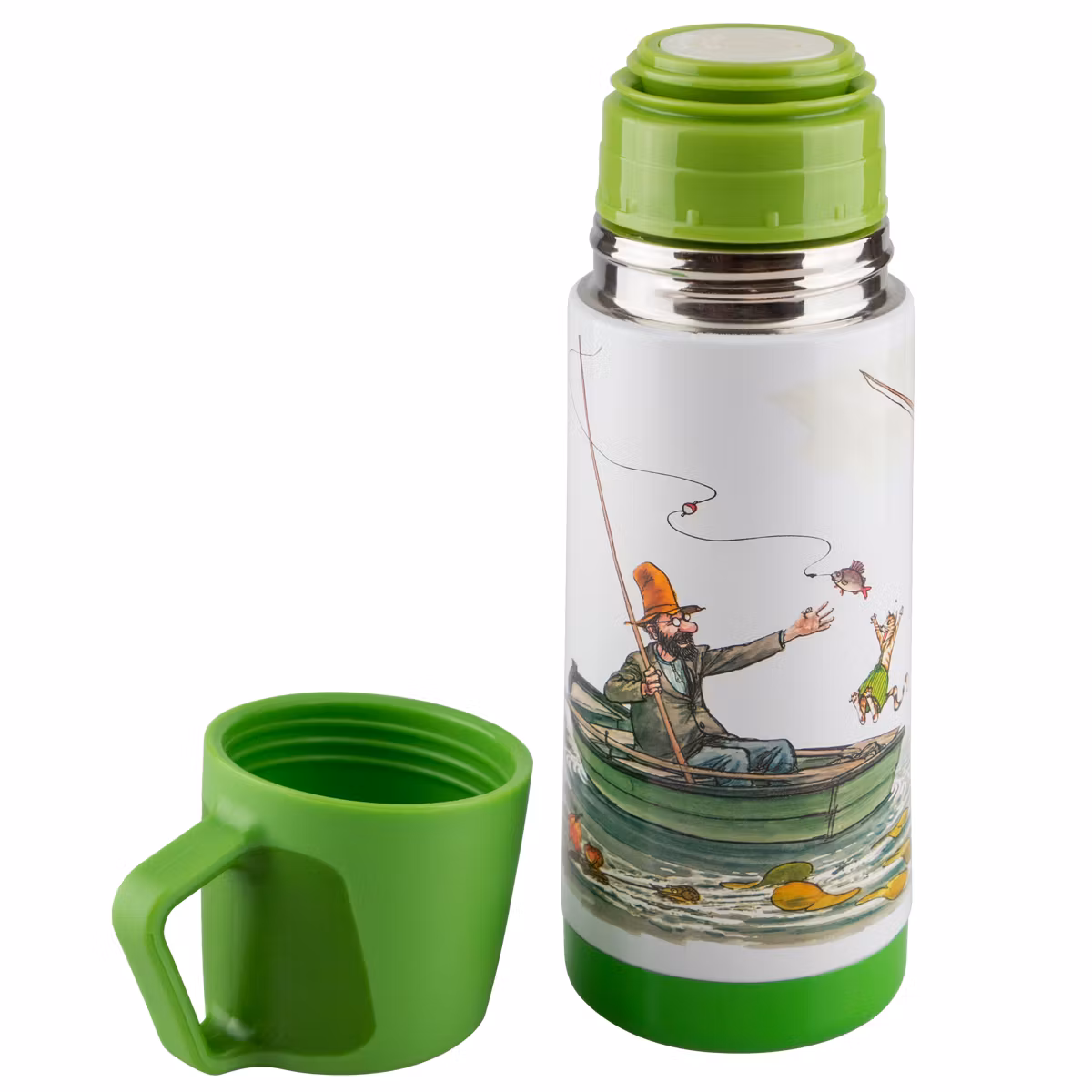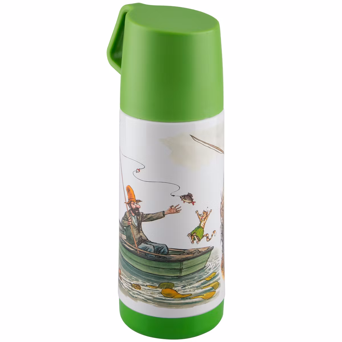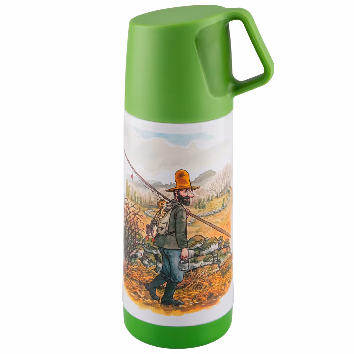 Termos Pettson och Findus 298 kr Produkten är tyvärr slut i lager. :( Termos med vacker Pettson och Findus-dekor av Sven Nordqvist.Material: rostfritt stål med mugg och kork i plast. Muggen har gummerat handtag. Storlek: höjd 20 cm, rymmer 350 ml